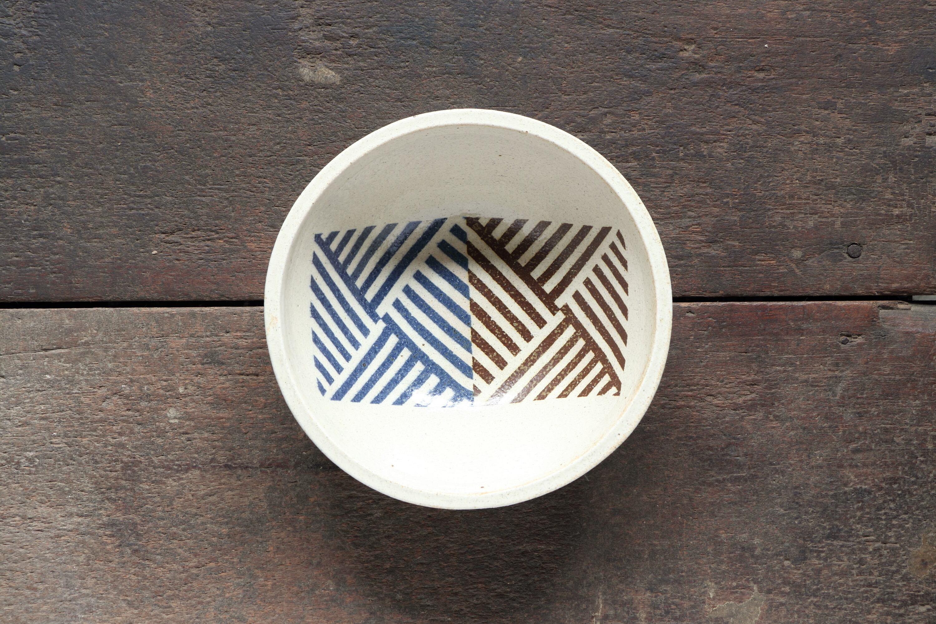 杉本さんの練り込みの器は石膏型で成形されるシンプルな形に、ストライプやチェックなどポップで現代的な模様が特徴。
