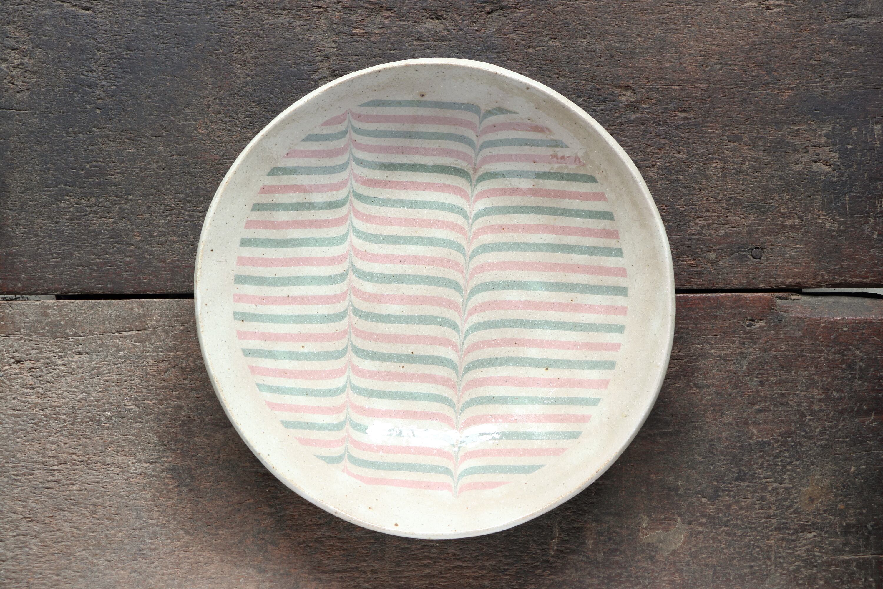 杉本さんの練り込みの器は石膏型で成形されるシンプルな形に、ストライプやチェックなどポップで現代的な模様が特徴。